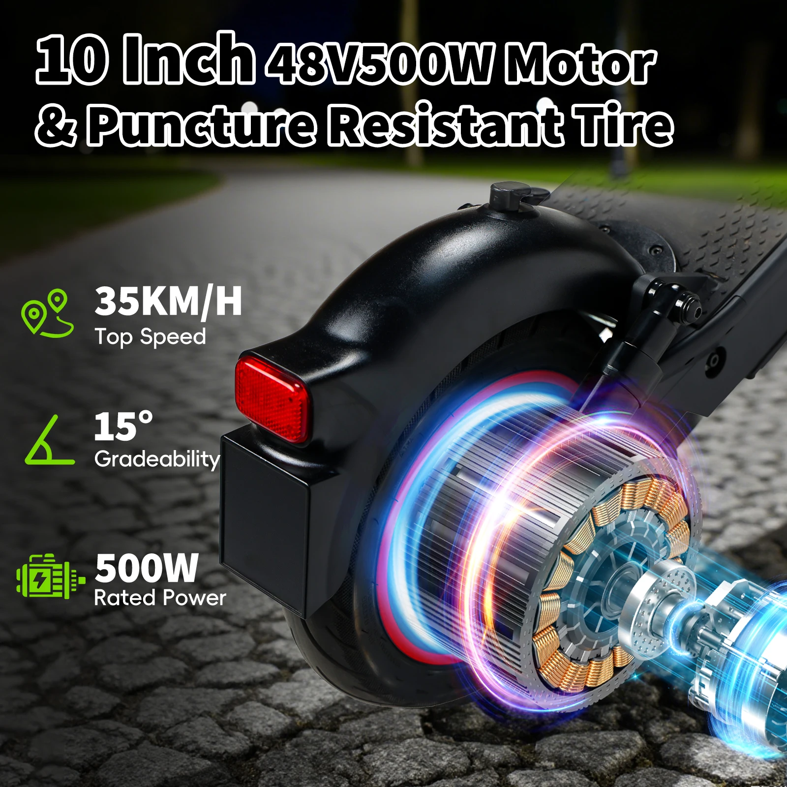 Powered by a 500W brushless motor, the Varstrom VS10 reaches speeds of up to 35 km/h (22 mph) and delivers 40Nm of torque for rapid acceleration. Dual suspension and 10″ pneumatic tires ensure a comfortable ride, easily absorbing potholes and bumps in urban terrain. For safe stopping power, dual disc brakes allow you to halt within 4 meters at 30 km/h.