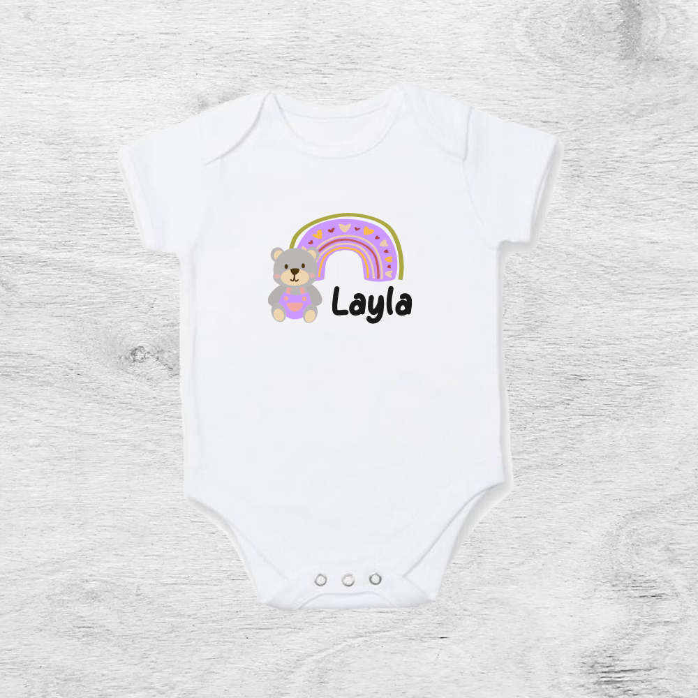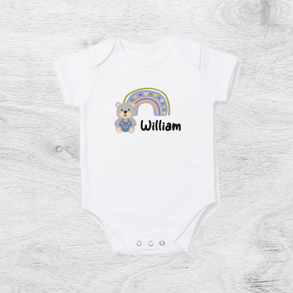 Celebrate a new arrival with our adorable Teddy Bear with Rainbow Personalised Baby Vest – a super soft cotton vest featuring a sweet teddy bear cuddling a colourful rainbow. Customise it with baby’s name and choose between a blue or pink theme to make it truly one-of-a-kind.